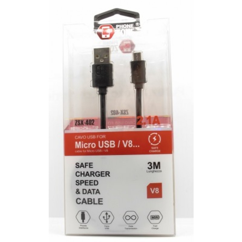 CAVO ALTA QUALITA' RICARICA SMARTPHONE MICRO USB V8 2.1A 3MT D:3.8mm