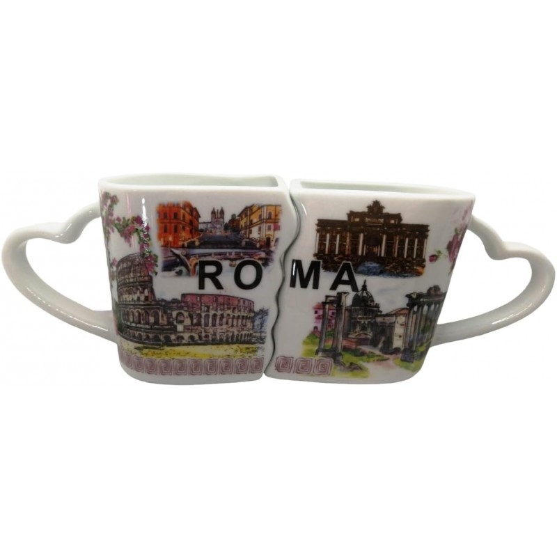 Un ricordo romantico di Roma Tazze a Coppia Souvenir Roma con il manico dell'impugnatura a forma di cuore, avvicinando le due tazze si formano due innamorati che si baciano. Le tazze a coppia e' un bellissimo ricordo romantico e un indimenticabile souvenir da Roma.