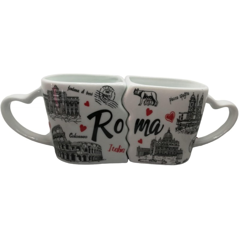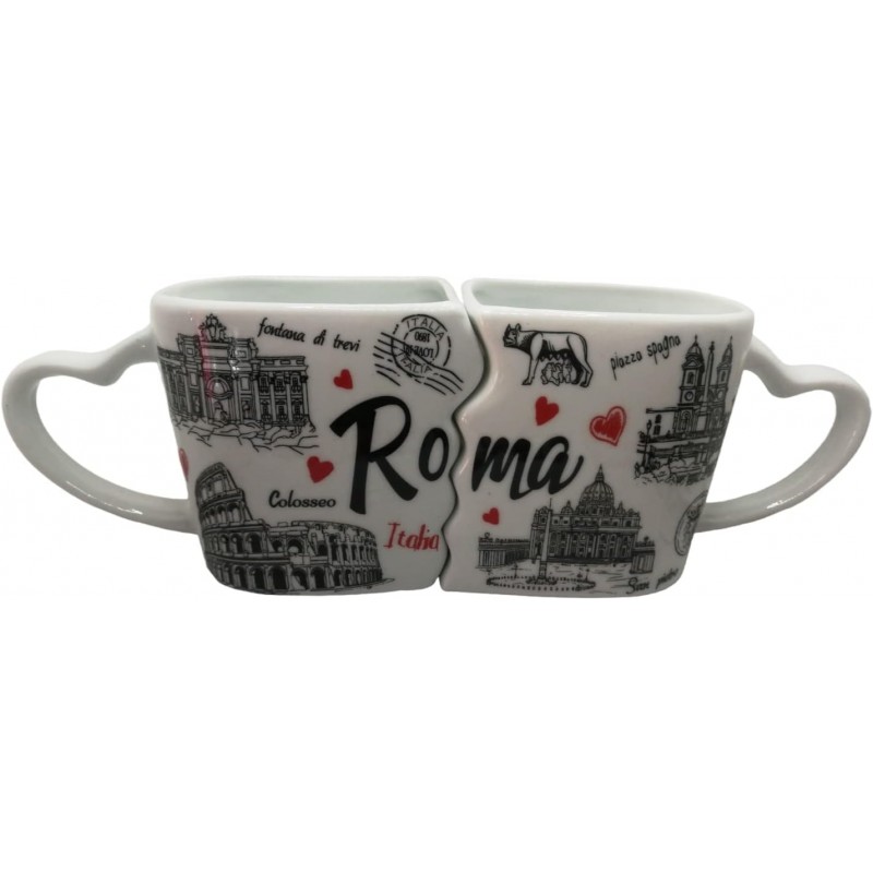 Un ricordo romantico di Roma Tazze a Coppia Souvenir Roma con il manico dell'impugnatura a forma di cuore, avvicinando le due tazze si formano due innamorati che si baciano. Le tazze a coppia e' un bellissimo ricordo romantico e un indimenticabile souvenir da Roma.