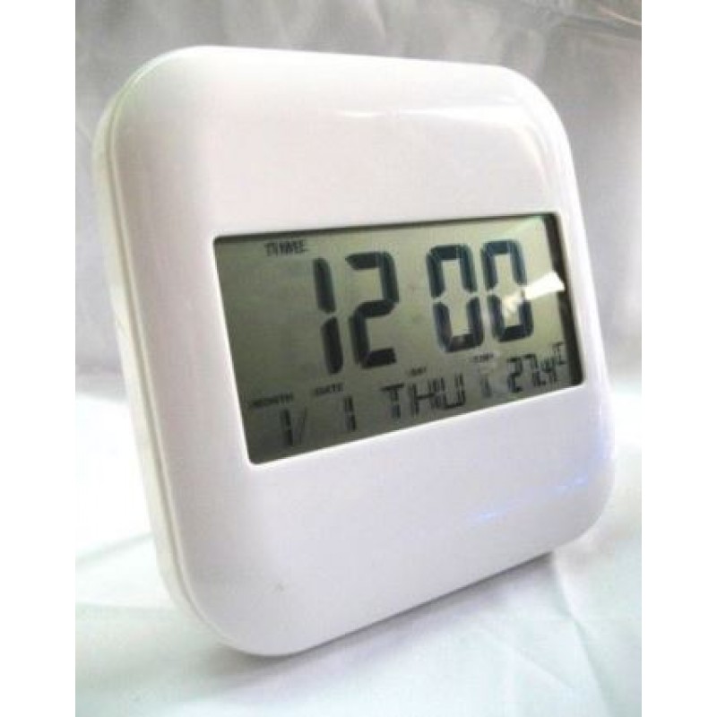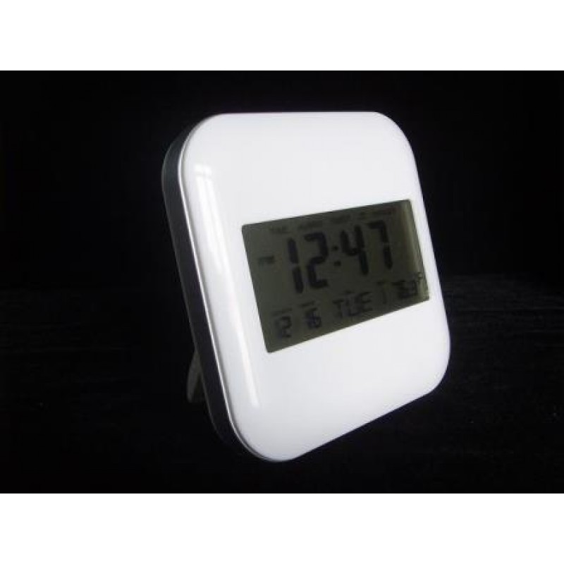 Funziona a batterie AAA 2x(non incluse), integra anche un termometro, puo essere anche poggiata sul comodino grazie alle staffe integrate.