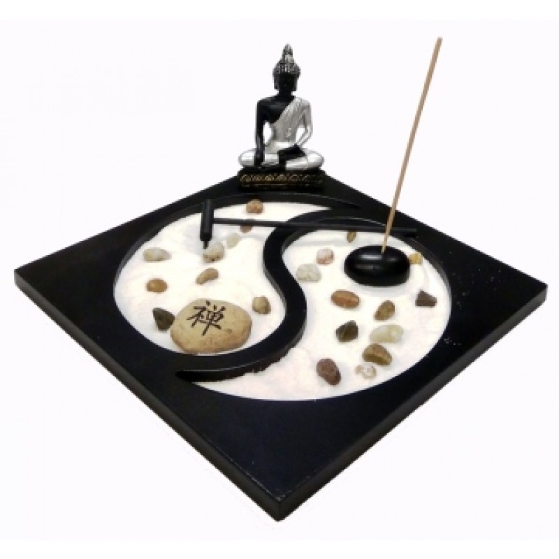 Include: Vassoio Zen sabbia, statua di buddha, rastrello, incensiere, sabbia e sassolini